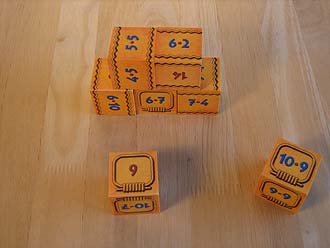 Die 30 Rechenwürfel unterteilen sich in zwei Gruppen, die sich durch die grafische Umrandung unterscheiden: [1] Die erste Gruppe, welche durch Zick-Zack-Linien gekennzeichnet ist, stellt die leichteren Einmaleins-Aufgaben dar. [2] Die zweite Gruppe, durch einen Rahmen gekennzeichnet, stellen die schwierigeren Aufgaben dar. Die Kinder können so den Schwierigkeitsgrad selbst bestimmen. |