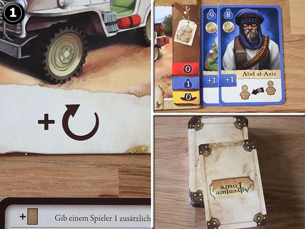 Jedes Expeditionstableau ist doppelseitig bedruckt. Auf der Vorderseite ist immer ein Kamel mit den gleichen Werten für Technik, Proviant und Kleidung. Diese Seite zeigt keine Spezialfähigkeit.