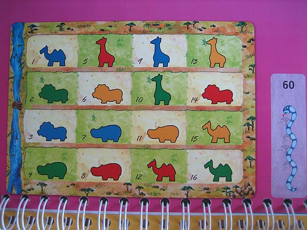 Jeder der 60 Aufgabenseiten im Spiralblock zeigt links eine Startaufstellung der Tiere. Die Hintergrundfarbe und die links abgebildete Schlange kennzeichnen dabei den Schwierigkeitsgrad der Aufgabe. Je größer die Schlange, desto schwieriger die Aufgabe. |