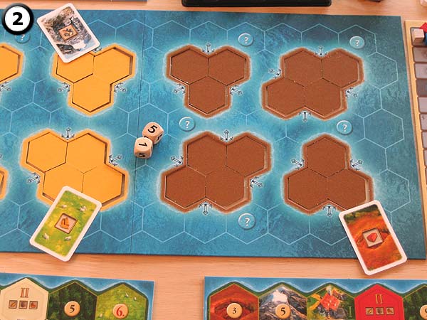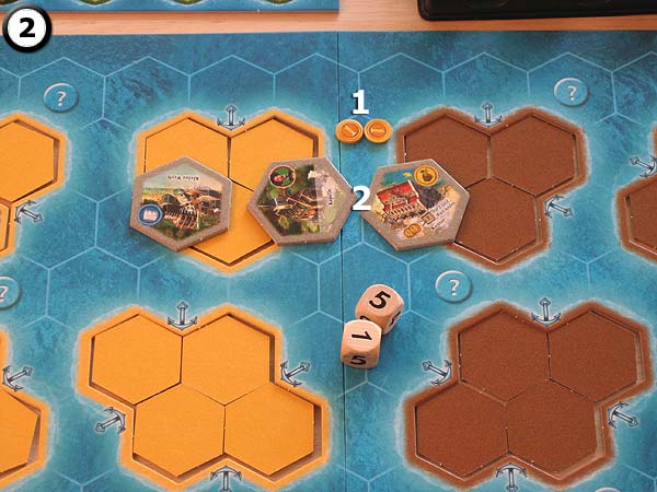 1) Ertragsphase. 2W6 würfeln und sich den Rohstoff/die Rohstoffe entsprechend der Würfelzahl nehmen.