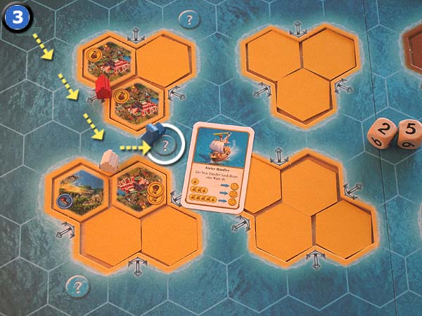 Beim Ziehen der Schiffe darf sich ein Spieler Inselkärtchen ansehen, Kolonien gründen und muss mögliche Begegnungen abhandeln. Beim Gründen einer Kolonie wird ein Schiff zerstört.