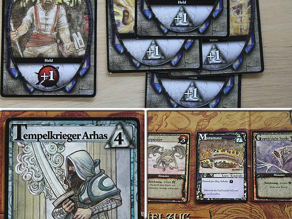 Beim Kultisten im Spiel haben wir uns gefragt, warum dieser nicht fest auf dem Spielplan aufgedruckt wurde, da er eh nicht aus dem Spiel entfernt wird. Außerdem fehlt bei ihm der Hinweis, dass er nach einem Kampf nicht abgelegt wird. Dies würde vor allem Neulingen im Spiel helfen.