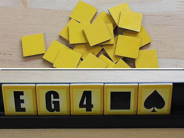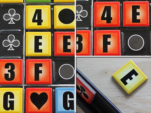 Jedes Plättchen (außer dem Joker) zeigt entweder eine Zahl, Buchstabe oder Symbol und somit wohin es gelegt werden kann. Eine 1 kann zum Beispiel auf jedes der 9 Felder der Spalte 1 gelegt werden.