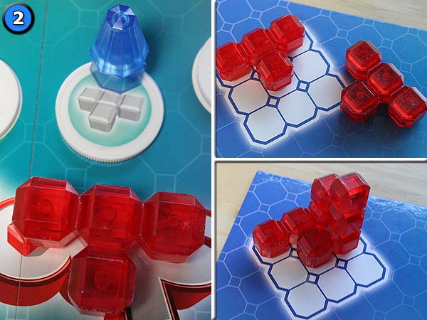– Alle Kubus- und Aktionsscheiben werden verdeckt gemischt und verdeckt auf die 20 Spielplanfelder verteilt.