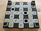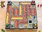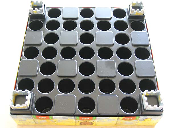 [1] Unter dem Boden der Burg befinden sich die Schiebeplättchen. Wie der Name schon sagt, können diese später verschoben werden und so ändert sich das Aussehen des Spielfelds mit jedem Verschieben. Auf einigen Schiebeplättchen sind Käsesorten abgebildet. Steht ein Spieler gleichzeitig mit 2 seiner Mäuse auf dem gleichen Symbol, dann erhält er dieses Käsestück (kleine Plättchen) als Belohnung. [2] Das Spielfeld ist am Anfang durch Dächer verdeckt. Die Spieler müssen erst unter diese schauen, um sich einen Überblick zu verschaffen und um den Käse einsammeln zu können. |