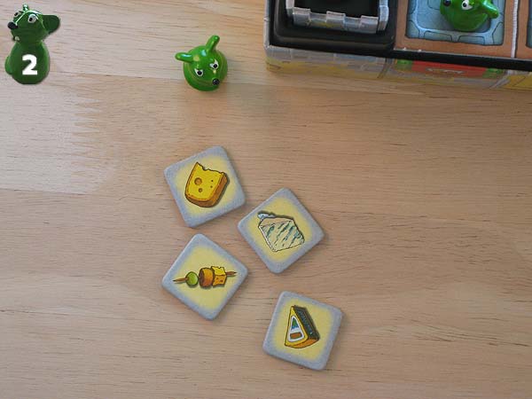 Die Spieler müssen, um Käsestücke zu sammeln, mit zwei Mäusen auf dem gleichen Käsesymbol stehen. Schaffen sie dass, dann erhalten sie das Sammelplättchen der entsprechenden Käsesorte. Jede Käsesorte kann dabei nur einmal gesammelt werden!