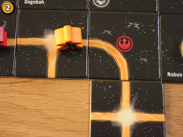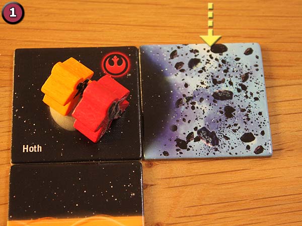 – Optional einen eigenen Meeple auf einen Bereich des eben gelegten Plättchens stellen. Je nach Plättchen kann dies eine Handelsroute, ein Asteroidenfeld oder ein Planet sein. Ausnahme von der Regel sind Planeten. Hier kann ein Spieler auf einen Planeten angrenzend zum eben gelegten Plättchen einsetzen.