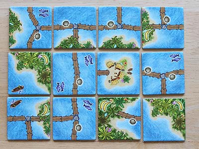 Es gibt 4 verschiedene Gebiete, welche auf einer Landschaftskarte zu sehen sind: 1.) Meeresteile – Hier findet sich häufiger Fisch, welcher von den Spielern gefangen werden kann. 2.) Stegabschnitte – Auf den Verbindungen zwischen den Inseln liegen häufiger Muscheln, welche von den Spielern eingesammelt werden können. 3.) Inselteile – Hier finden sich Bananen, welche die dritte Ressource im Spiel darstellen. 4.) Märkte – Es gibt Landschaftskarten auf denen nur ein Markt zu finden ist. Ein Markt funktioniert so, dass er ringsherum mit Landschaftskarten umgeben sein muss, um gewertet zu werden. Eine Wertung bringt dem Spieler ein beliebiges offen liegendes Schiffsplättchen und damit 3 bis 6 Punkte. |