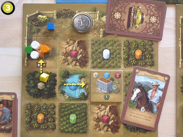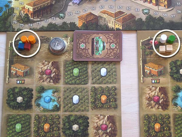 Jeder Spieler erhält eine Spielfigur, einen Spielstein, einen Plantagenplan, je 2 beliebige Bau- und Rohstoffe und 10 Pesos.