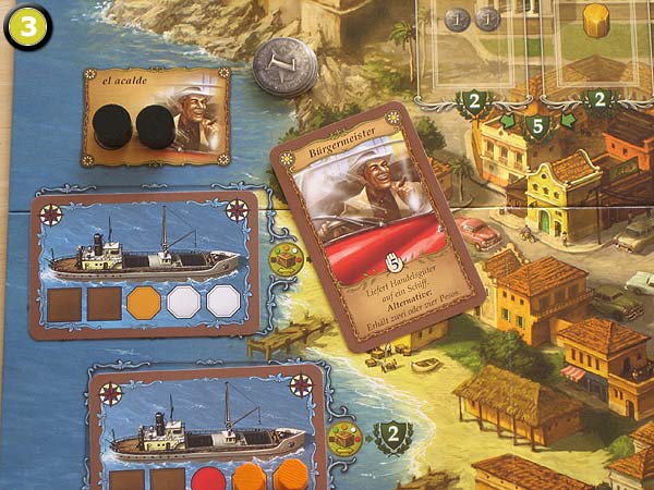 Die Schiffe ankern im Hafen von Cuba. Spieler können durch den Transport von Rohstoffen oder Waren, von ihren Plantagen auf die Schiffe, Siegpunkte erlangen.