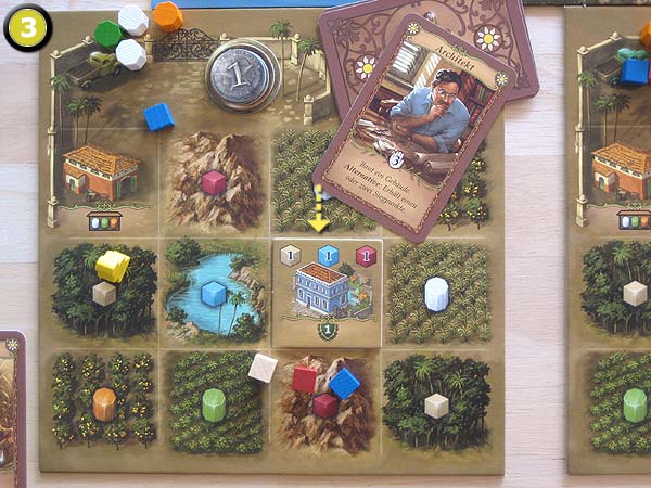 [3] Im Vorhof werden Baustoffe und Waren dauerhaft und Rohstoffe nur für die aktuelle Runde gelagert.