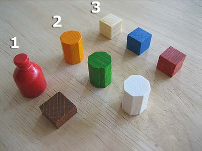 3. Ein Stimm- und ein Vetoplättchen. 6 schwarze Markierungssteine.