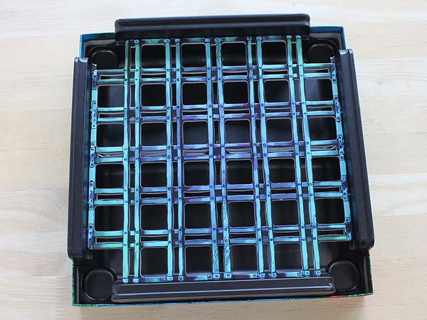 In den Schachtelboden kommt das unterirdische Labyrinth, also eigentlich das Raster davon. In die Aussparungen des unterirdischen Labyrinths kommen die hölzernen Mauerteile und bilden so das spätere Labyrinth. Damit die Spieler im Spiel diese Mauern nicht mehr sehen können, werden sie mit der Bodenplatte abgedeckt. |