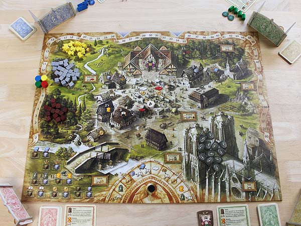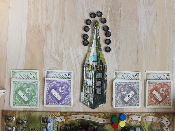 – Getreide, Holz und Stein kommen auf die entsprechenden Felder des Spielplans. Die Frömmigkeitsmarker kommen auf die Kathedrale.