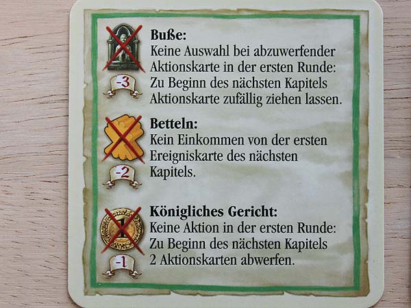 Das Spiel besteht aus 4 Kapiteln und jede Kapitel besteht aus 11 Ereigniskarten. [2] Im Spiel werden aber immer nur 6 der 11 Ereigniskarten verwendet, so dass jedes Spiel immer etwas anders verläuft. Sind die 6 Ereigniskarten nach 6 Runden verbraucht, dann findet das Ende des Kapitels statt. [1] Hierzu liegt unter jedem Stapel eine Kapitelschlusskarte. Wichtig für die Spieler ist, dass sie genau zu diesem Zeitpunkt Pflichtabgaben leisten müssen, um nicht zu Beginn des folgenden Kapitels bestraft zu werden. |