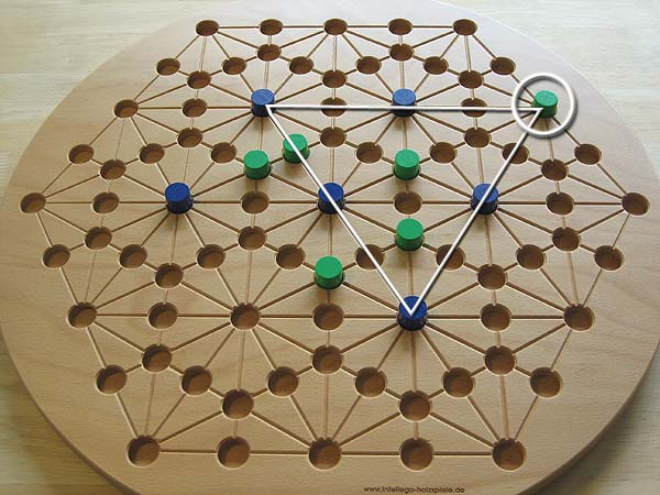 – Gewinnt während oder direkt nach dem Stecken der 12 Spielsteine noch kein Spieler das Spiel, dann wird abwechselnd je ein Spielstein um 1 Loch auf dem Spielbrett weiterbewegt. Andere Spielsteine dürfen hierbei nicht übersprungen werden.