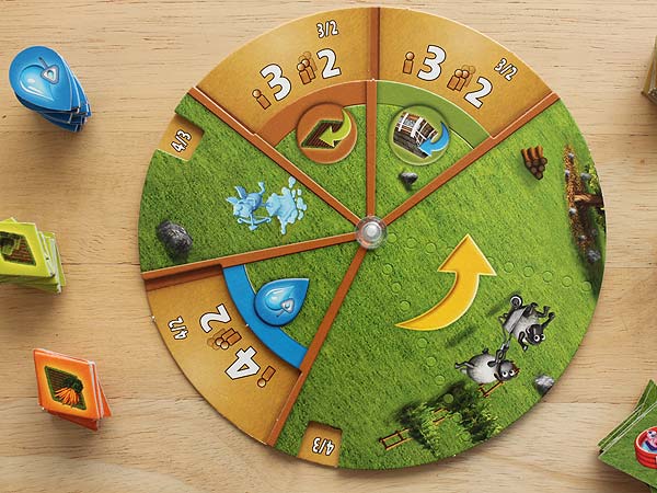 Jeder Spieler hat ein identisches Ackerland-Tableau und dieses zeigt rechts oben einen Stall, wo jeder Spieler je ein Schaf, Schwein, Kuh und Pferd stehen hat. Der Rest besteht aus 7 Bereichen und in jedem Bereich gibt es eine Weide für ein Tier und 1 bis 4 Anbaufelder für die Futterpflanzen. In der Mitte der 7 Bereiche befindet sich ein Spielerrad, welches auch in 7 Bereiche unterteilt ist. Jeder Bereich zeigt an, was ein Spieler machen kann. Zum Beispiel Futterpflanzen ernten, ein Schaf auf eine Weide stellen oder Mais aussähen. Die Position des Spielerrads zeigt somit an, in welchem Bereich welche Aktion zur Verfügung steht. Mit Hilfe von Wasser kann das Spielerrad gegen den Uhrzeigersinn im Spiel ein Bereich weitergedreht werden. |