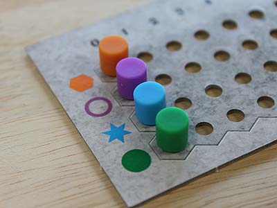 Für jeden Punkt in einer Farbe, wird der entsprechende Wertungsstein um 1 Feld nach rechts verschoben.