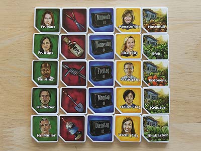 Auf jedem Kriminalfall steht eine Frage, welche der Spieler beantworten muss, zum Beispiel: Mit welcher Waffe wurde Renate am Donnerstag ermordet? Um auf die Lösung zu kommen, stehen dem Spieler 25 Spielsteine zur Verfügung, welche er in das Mordraster der Spielbox legt. Je 5 Spielsteine stehen für die 5 Schrebergärten, deren 5 Besitzer, für 5 Besucher, für 5 Gegenstände die in den Schrebergärten auftauchen und für Wochentage an denen zum Beispiel der Besuch gekommen ist oder ein Gegenstand verwendet wurde. Hinweise auf den Kriminalfällen geben mehr oder weniger eindeutig an, wo welche Spielsteine hingelegt werden. Den Rest muss der Spieler durch Kombination von Hinweisen und logischem Denken selbst herausfinden. |