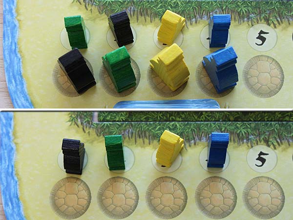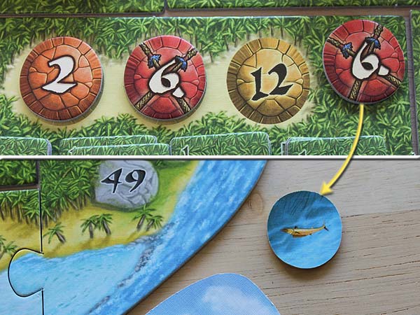 – Nicht gelegte Preisplättchen werden umgedreht, es erscheinen 1 oder 3 Fische, und an den Strand gelegt.