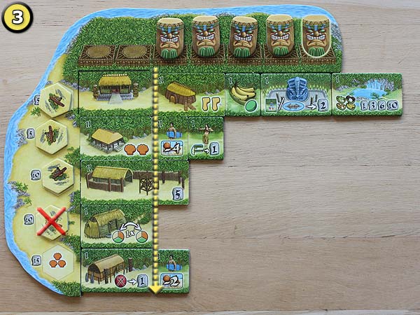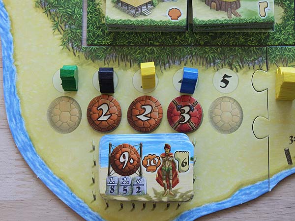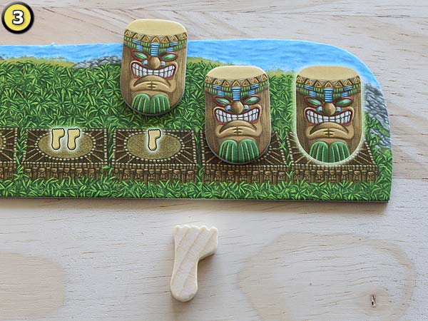 – Ort – Preisplättchen einfach oder doppelt bezahlen und eines der dort liegenden Ortsplättchen mit der Seite I (einfach bezahlt) oder II (doppelt bezahlt) nehmen. Bei Kahunas oder Tikis werden 1 (einfach bezahlt) oder 2 (doppelt bezahlt) Plättchen genommen. Die Plättchen werden in eines seiner Dörfer gelegt bzw. die Kahunas und Tikis auf den beiden dazugehörigen Leisten seines Winkels.