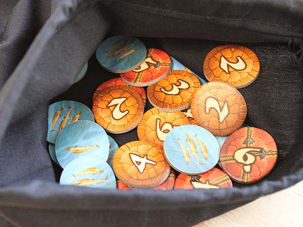 – Von jedem Spieler kommt ein kleiner Häuptling auf die 0 der Punkteleiste und in den Stoffbeutel. Der große Häuptling wird an den Strand gestellt.