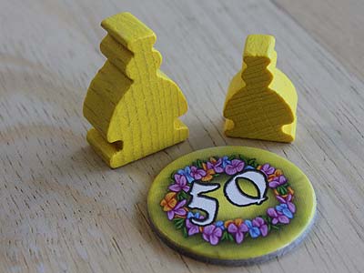 Können auf den dazugehörigen Orten zu dem dort liegenden Preis (Preisplättchen) erworben werden. Jedes Ortsplättchen hat zwei Seiten. Seite I kann ein Spieler für den einfachen Preis kaufen. Seite II für den doppelten Preis. Der Effekt auf Seite I und II ist identisch, d.h. es gibt zum Beispiel auf beiden Seiten Muscheln, Füße,… als Einkünfte, nur die Anzahl dieser ist unterschiedlich. Seite I bringt dem Spieler zum Beispiel eine Muschel und Seite II zwei Muscheln jede Runde. |