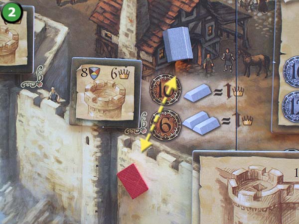 [2] Siegpunkte. Wird das Bauwerk mit dem Steinmetz errichtet, dann bekommt der erbauende Spieler die dort abgedruckten Siegpunkte.