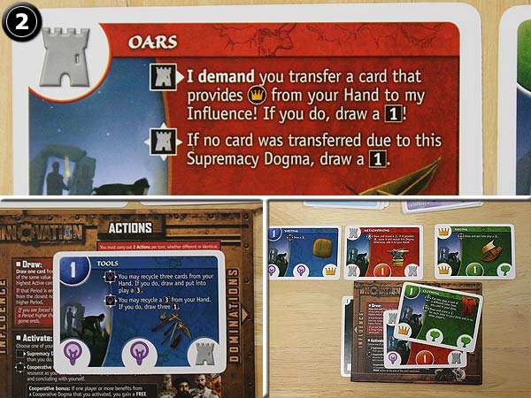 Auf der einen Seite erklärt die Spielertafel, welche Aktionen ein Spieler durchführen kann. Pro Spielzug muss ein Spieler 2 Aktionen durchführen, wobei er auch zweimal die gleiche Aktion wählen kann. Draw Play Activate Dominate |