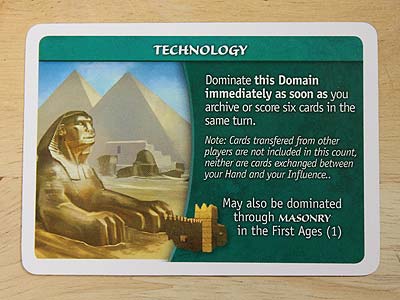Es gibt 5 Domains im Spiel, d.h. Wissensbereiche. Domains können auf zweierlei Art erworben werden, entweder über die Voraussetzung die auf der Karte steht oder über eine bestimmte Zeitalterkarte, die eine andere Voraussetzung ins Spiel bringt. Domains gehören zu den Karten, die ein Spieler sammeln kann, um das Spiel zu gewinnen. Domains bringen ihrem Besitzer keinen weiteren Vorteil, als etwas näher am Spielsieg zu sein. |