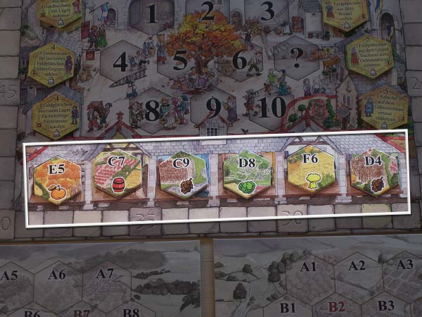 Auf jedem Feld des Gebietstableaus darf später im Spiel immer nur das Feldplättchen mit der gleichen alpha-numerischen Bezeichnung gelegt werden.
