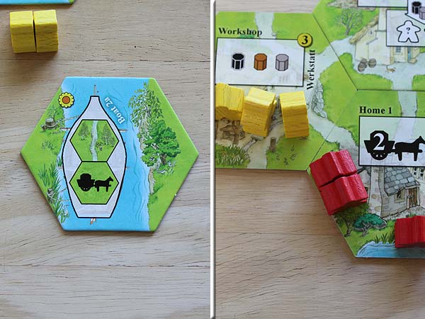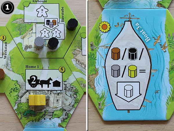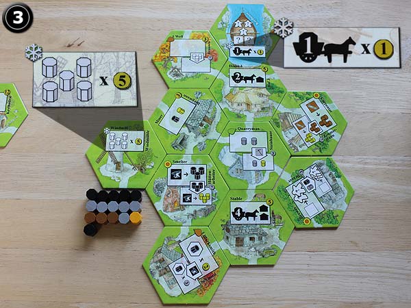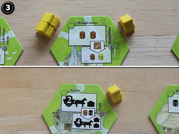 – Im fremden Dorf oder der allgemeinen Auslage produzierte Rohstoffe kommen auf das eigene Hofplättchen.