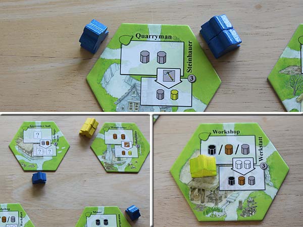 – Alternativ können Arbeiter auch auf ein beliebiges Dorfplättchen im eigenen Dorf, im Dorf eines Mitspielers oder in der allgemeinen Auslage gesetzt werden, um dort zu produzieren.