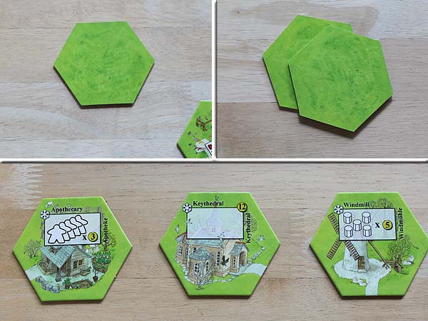 – Alle sechseckigen Plättchen werden nach Typ sortiert: Hof, Schiff, Reihenfolge, Frühjahr, Sommer, Herbst und Winter.