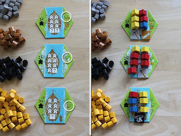 – Auf den Plättchen Scheune, Schmied, Steinbauhof und Holzbauhof zählen nur die dort liegenden Rohstoffe. Dort liegendes Gold kann als Ersatz-Rohstoff verwendet werden.