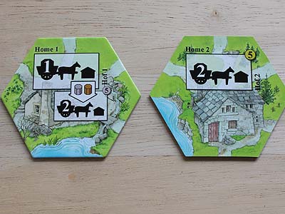 Jeder Spieler startet das Spiel mit einem inhaltlich identischen Hofplättchen. Inhaltlich heißt, dass jeder Spieler bei Aktivierung des Plättchens einen Rohstoff ein Feld weiter transportieren kann und anschließend darf er eines seiner Dorfplättchen aufwerten. Aufwerten bedeutet, dass er die darauf geforderten Ressourcen auf dem Plättchen liegen hat, diese abgibt und es dann umdreht. Bei diesem Hofplättchen wären es zum Beispiel ein Stein und ein Holz. Durch das Umdrehen/Aufwerten ist das Plättchen bei Spielende 5 Siegpunkte wert (Zahl steht auf dem Plättchen) und eine Aktivierung lässt den Spieler jetzt 2 Rohstoffe je 1 Feld oder 1 Rohstoff 2 Felder weit transportieren. Er kann weiterhin nur 1 Plättchen aufwerten, da weiterhin nur 1 Hütte abgebildet ist. |