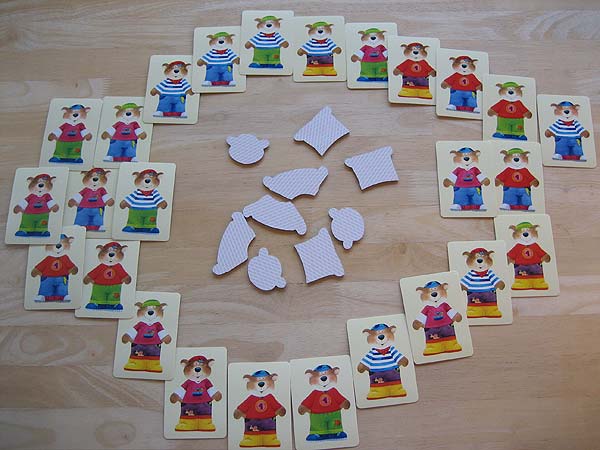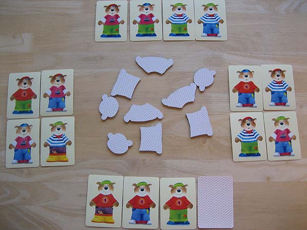 – Alle Bärenteile werden verdeckt gemischt und die Karten offen ausgelegt.