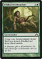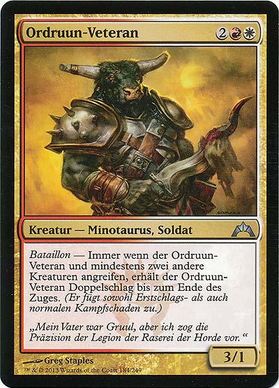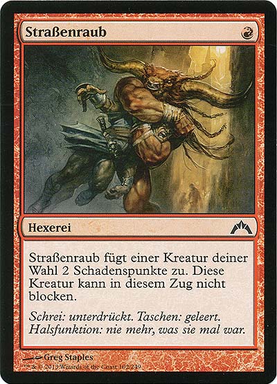 Gruul (rot/grün): Diese Farbkombination steht der vorigen in Aggressivität nur wenig nach, allerdings sind die Kreaturen meist etwas teurer, dafür aber eben auch größer als die Boros-Truppen. Die reichlich rabiaten Gruul-Clans haben es auch nicht so mit Angriff in Reih und Glied, sie werfen sich einfach bei der nächstbesten Gelegenheit in die Schlacht. In Regeln übersetzt heißt das, dass viele Gruul-Monster für einen geringen Manabetrag von der Hand abgeworfen werden können, um eine angreifende Kreatur mit ihren eigenen Werten zu verstärken – eine so abgeworfene 3/3-Kreatur mit Doppelschlag würde dem Ziel +3/+3 und Doppelschlag geben. Hoppla. Diese Fähigkeit nennt sich übrigens Blutrausch und hilft in der Defensive ebenfalls genau gar nicht. Dafür brauchen wir in unserem Deck keine Karten mehr an Kampftricks wie "Riesenwuchs" zu verschwenden, weil unsere Kreaturen das gleich mit erledigen. |