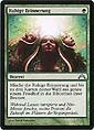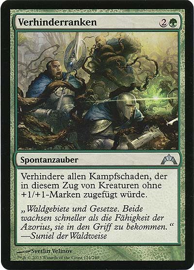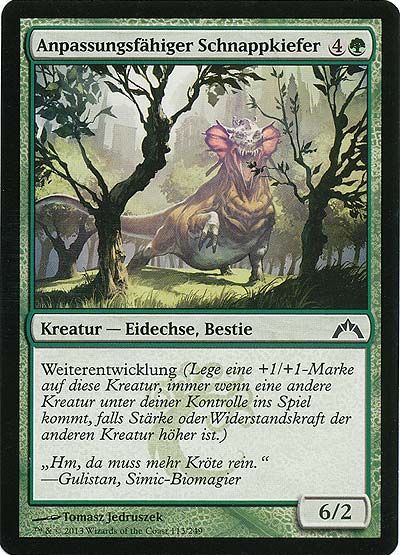 Simic (grün/blau): Eine Stufe weiter im Farbenspektrum stehen die Simic, die grüne Natur und blaue Wissenschaft vermischen und als Ergebnis lustige Mutanten kriegen, etwa die unblockbare "Schlüpfrige Krasis" (Kreaturentyp: Fisch, Mutant) oder das "Froschodil" (Frosch, Krokodil). Und weil wahre Evolution niemals abgeschlossen ist, besitzen all diese Wesen die Fähigkeit zur Weiterentwicklung: Wenn wir eine Kreatur ins Spiel bringen, deren Stärke größer ist als die Stärke unseres Mutanten bzw. dessen Widerstandskraft größer ist als dessen Widerstandskraft, kriegt der Mutant eine +1/+1-Marke. Mit der richtigen Kreaturenkette lassen sich da schon ziemliche Monster züchten. Nachteil: Wenn wir unsere Tierchen in der falschen Reihenfolge ziehen, klappt das alles manchmal nicht so recht. Trotzdem ist Weiterentwicklung eine äußerst amüsante Angelegenheit. Zumal viele Kreaturen mit ihren +1/+1 Marken auch noch andere Sachen anfangen können, sich regenerieren zum Beispiel… |