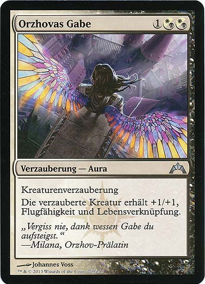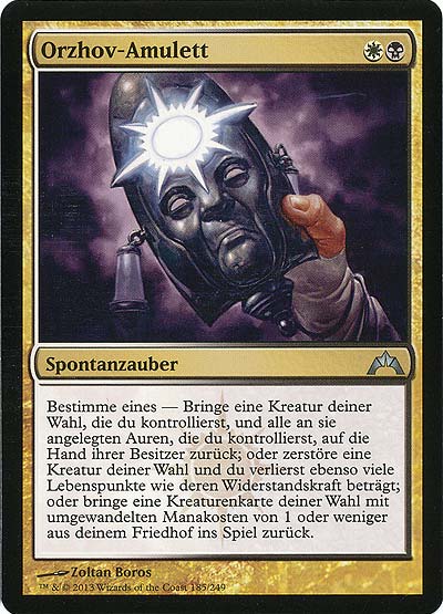 Orzhov (schwarz/weiß): Zuletzt ist das Orzhov-Syndikat an der Reihe, diese düstere Kombination aus religiösem Orden und gieriger Mafia. Wenn man nach Gemeinsamkeiten von Schwarz und Weiß sucht, findet man nicht sehr viel, am ehesten die Fähigkeit "Lebensverknüpfung", die dem Beherrscher einer Kreatur, die Kampfschaden austeilt, den gleichen Betrag in Lebenspunkten gibt. So ähnlich funktioniert auch die Fähigkeit Abnötigen, allerdings ist sie anders als Chiffrieren (oder eben auch Lebensverknüpfung) nicht von Kampfschaden abhängig. Stattdessen können wir jedes Mal, wenn wir einen Spruch wirken, für jede Karte mit Abnötigen, die wir kontrollieren, ein weißes oder schwarzes Mana bezahlen – und schon können wir dem Gegner einen Lebenspunkt abziehen und erhalten selber einen. Das ist offensichtlich ziemlich brachial, denn wenn wir einige stabile Verteidiger mit Abnötigen im Spiel haben, kann der Gegner nur noch zusehen, wie wir ihn mit jedem Spruch aussaugen. |