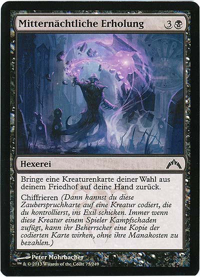 Dimir (blau/schwarz): Das verschlagene Haus Dimir war ein geheimer Favorit vieler Spieler im ursprünglichen Ravnica-Block. Tja, liebe Dimir-Fans, ich muss euch leider sagen, dass das Haus der Spione beim Gildensturm nicht sehr gut davonkommt. Seine Fähigkeit nennt sich Chiffrieren und funktioniert folgendermaßen: Nur Hexereien und Spontanzauber haben Chiffrieren; wenn wir eine solche Karte spielen, können wir sie nach ihrem Effekt an eine unserer Kreaturen anfügen (wie beim Einprägen aus Mirrodin). Jedes Mal, wenn diese Kreatur dann einem Gegner Kampfschaden zufügt, können wir den Spruch kostenlos noch einmal wirken. Nun sind Blau und Schwarz natürlich die Farben mit den meisten Kreaturen, die auf die eine oder andere Art und Weise schwer zu blocken sind (Fliegen, Einschüchterung…), trotzdem ist diese Voraussetzung mit Abstand am schwersten zu erfüllen, weil der Gegner bei ihr am meisten mitzureden hat. Zudem sind die meisten Chiffrieren-Sprüche zu teuer und von Haus aus nicht besonders mächtig. Und auch hier gilt, dass die Defensive rein gar nicht unterstützt wird, wo die meistens doch eher kontrollastig ausgerichteten blau/schwarzen Decks eigentlich viel lieber Hilfe hätten. |