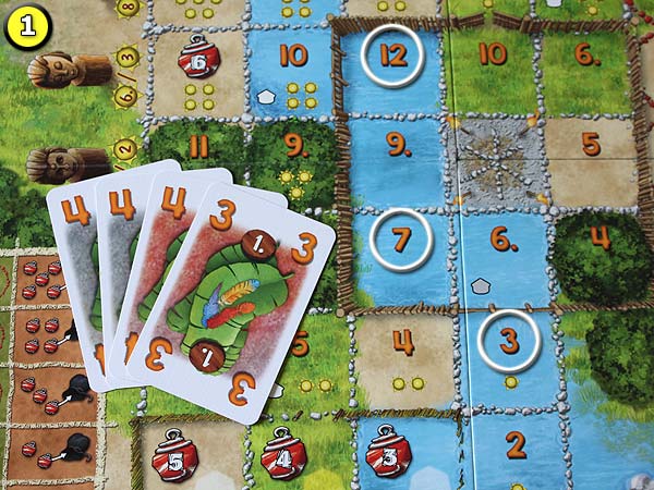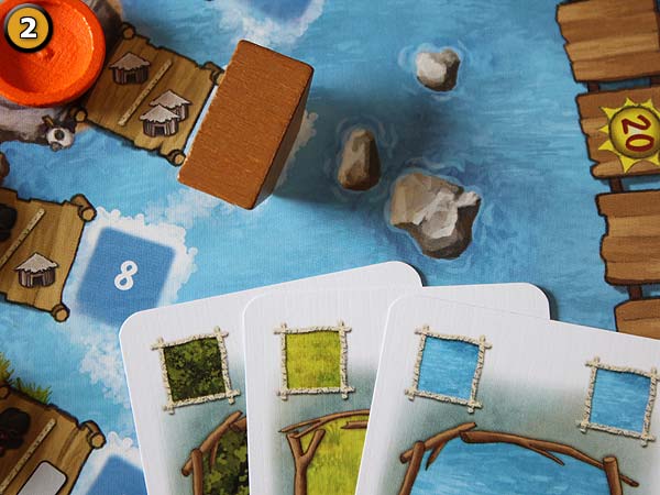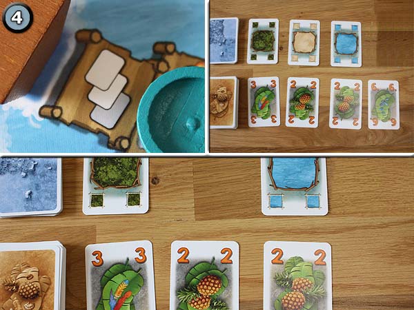 – Die Pfahlplättchen werden absteigend offen aufeinander gestapelt und auf das kleine Inselfeld neben dem Pfahlplatz gelegt.