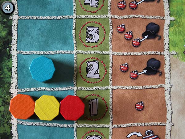– Eine Säule, die Häuptlingssäule, startet auf dem Feld 0 des Häuptlingsstegs und die zweite Säule, die Amulettsäule, startet neben dem Feld 0 der Amulettleiste.