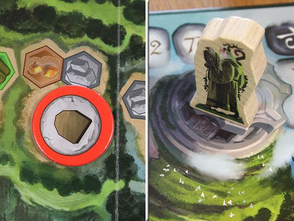 Spieleranzahl – Der Spielplan ist doppelseitig bedruckt und die zu spielende Seite hängt von der Anzahl der Spieler ab. Unabhängig von der Anzahl der Spieler hat der Spielplan 3 Steinfelder für den Druiden, bevor dieser den Pfad des Druiden betritt.