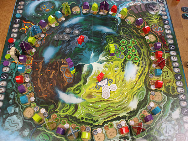 Der Spielablauf hat aber durchaus einen guten Spannungsbogen. Zu Beginn bauen die Spieler noch einzelne Hütten, um Güter zu sparen, welche dann im Spielverlauf zu Siedlungen verschmelzen. Tempel begrenzen diese Siedlungen und können so auch die Baukosten für neue Hütten begrenzen. Die Wertungen des Druiden werden immer länger, da er immer alle Hütten einer Siedlung abklappert. Auf diese Umstände müssen sich die Spieler im Spielverlauf einstellen.