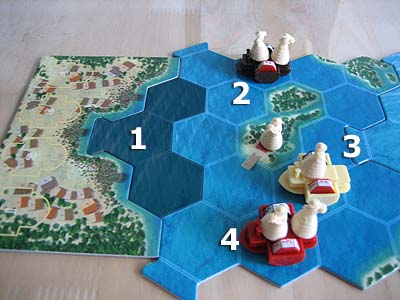 Das Spiel geht so weiter bis die Landungsmole an das letzte Flussteil angelegt wird. Um an der Landungsmole anlegen zu können, muss der Raddampfer eines Spielers mit einer Geschwindigkeit von 1 auf eines der drei Felder [1] vor der Landungsmole zum stehen kommen. Außerdem können nur Spieler an der Landungsmole anlegen, die auch zwei Passagiere mit sich führen. Aus diesem Grund kann der beige Spieler [3] noch nicht anlegen. Die anderen beiden Spieler [2 und 4] haben schon zwei Passagiere, aber noch eine zu hohe Geschwindigkeit. In diesem Fall Zwei statt Eins. |