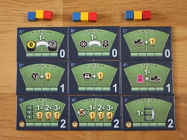 Es gibt in jedem Spiel immer 3 Forschungsstränge mit je 3 Laborplättchen, welche jeweils eine Erfindung darstellen und von oben nach unten erfunden werden müssen. Labore bringen in den Stufen 0 und 1 keine direkten Punkte, aber sie verbessern die Möglichkeiten des Spielers oder bringen diesem bei bestimmten Aktionen Zusatzpunkte. Im untersten Bereich liegen zudem auch Labore, welche dem Spieler Punkte bei Spielende bringen können. |
