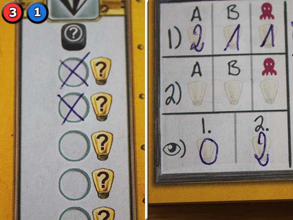 Jeder Spieler benutzt sein eigenes Wertungsblatt, welches den Teil der Tiefseeforschungsstation darstellt indem er arbeitet. Oben sind die 5 Aktionsmöglichkeiten und das Fangen von Oktopoden zu sehen, welche den 6 Seiten des weißen Aktionswürfels entsprechen. Ausgeführte Aktionen werden auf dem Wertungsblatt angekreuzt. Unten befinden sich die Eintragungsmöglichkeiten für die in den 3 Runden errungenen Punkte. Jede Runde hat sein eigenes Kästchen. Ganz rechts gibt es noch 2 Felder für die Wertung bei Spielende. |