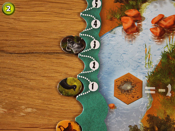 – Es wird mit der Landschaft mit den 5 Bonusfeldern gespielt. Alle Punkteanzeiger werden an die Einbuchtungen des Felds -3 gelegt