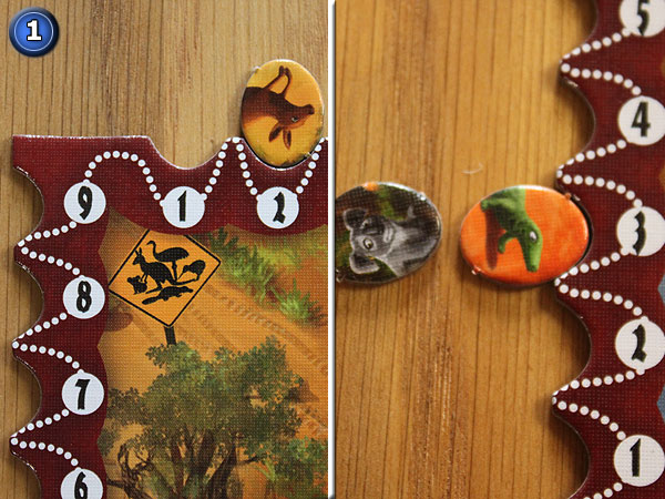 – Jeder Spieler nimmt sich 1 Outback-Landschaft, von jeder Tierart 1 Punkteanzeiger und von jeder Tierart 1 Bonusplättchen